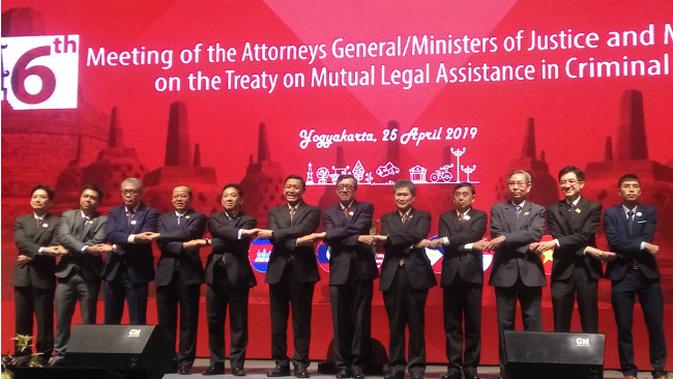 Liputan6.com, Yogyakarta - Jaksa agung dan menteri bidang hukum negara ASEAN berkumpul di Yogyakarta untuk menggelar pertemuan, Kamis (25/4/2019). Rapat ini dibuka oleh Menkopolhukam Wiranto yang mengapresiasi langkah Menkumham Yasona Laoly sebagai inisiator pertemuan ini.