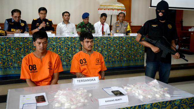 Dua warga Thailand tersangka penyelundup sabu-sabu, Prakob Seetasang (08) dan Adison Phonlamat (03) dalam konferensi pers di Kantor Bea Cukai Ngurah Rai, Denpasar, Senin (27/5/2019). Mereka ditangkap setelah mencoba menyelundupkan 989,66 gram sabu-sabu dari Bangkok menuju Bali. (SONNY TUMBELAKA/AFP)