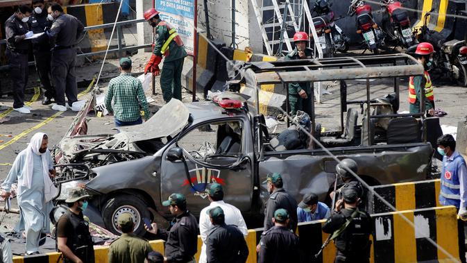 Petugas keamanan dan anggota tim penjinak bom mengamankan lokasi ledakan bom di luar tempat suci umat muslim Sufi, Lahore, Pakistan, Rabu (8/5/2019). Selama ini, pengikut aliran Sufi di Pakistan kerap menjadi target serangan mematikan oleh kelompok militan Islam, termasuk ISIS. (REUTERS/Mohsin Raza)