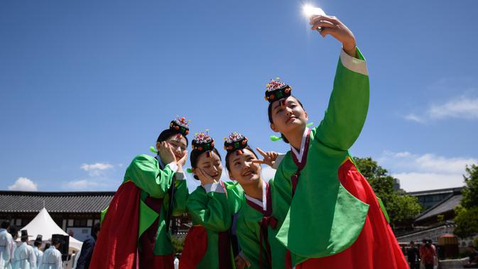 Para wanita muda berswafoto mengenakan pakaian tradisional hanbok setelah upacara “Coming of Age” di Namsan Hanok Village, Seoul, Senin (20/5/2019). Di Korea Selatan, Coming of Age Day atau hari kedewasaan dirayakan secara nasional setiap tahun pada hari Senin ketiga di bulan Mei. (Ed JONES/AFP)