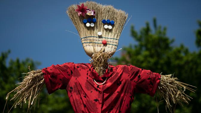 Sebuah orang-orangan sawah ditampilkan selama 'Scarecrows Fair' di Castellar, distrik Provinsi Cuneo, Italia, 10 Mei 2019. Dalam acara tahunan itu, penduduk membuat orang-orangan sawah kreasi mereka sendiri untuk dipajangkan di kebun, halaman, ladang dan persimpangan jalan. (MARCO BERTORELLO/AFP)