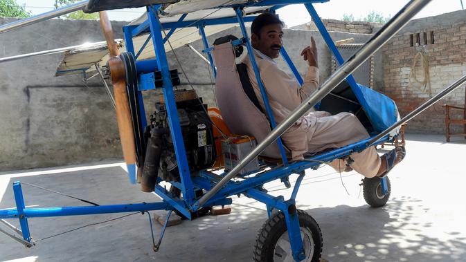 Warga melihat pesawat buatan Muhammad Fayyaz di Desa Tabur, Provinsi Punjab, Pakistan, 8 April 2019. Pesawat kecil tersebut dirakit menggunakan mesin dari alat pemotong aspal, sayapnya dari karung goni, dan roda-rodanya diambil dari roda becak. (ARIF ALI/AFP)
