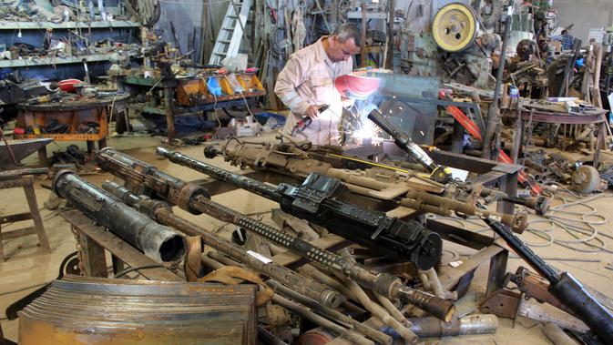 Dua orang relawan memperbaiki senjata milik pasukan pemerintah Libya di sebuah bengkel di Misrata, Libya, 2 Mei 2019. Pasukan pemerintah kesepakatan nasional (GNA) terlibat pertempuran dengan Pasukan Nasional Libya (LNA) pimpinan Khalifa Haftar. (REUTERS/Ayman al-Sahili)