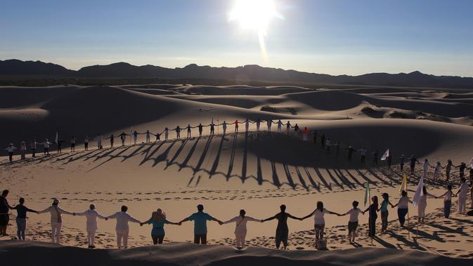Seorang wanita berpose selama kelas yoga yang diselenggarakan oleh komunitas YSYoga System di gurun Samalayuca, negara bagian Chihuahua, Meksiko pada 25 Mei 2019. Kelas yoga di padang pasir ini diselenggarakan setiap tahun, dan pesertanya semakin lama semakin bertambah banyak. (Herika MARTINEZ/AFP)