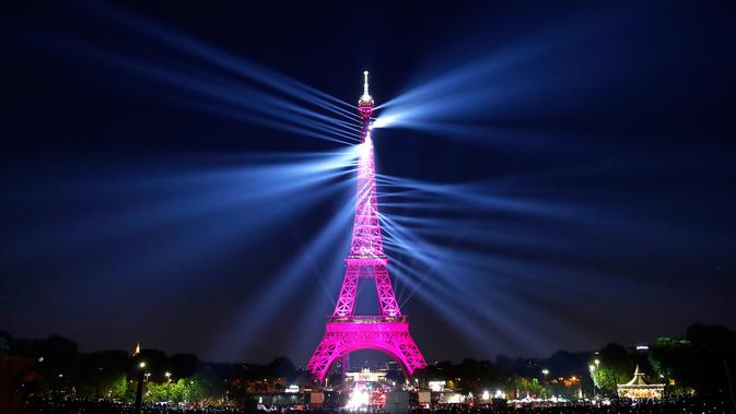 Pertunjukan cahaya menerangi Menara Eiffel saat perayaan ulang tahunnya ke-130 tahun di Paris, Rabu (15/5/2019). Paris memberikan ucapan ulang tahun kepada Menara Eiffel dengan pertunjukan laser yang rumit menelusuri kembali sejarah 130 tahun monumen itu. (AP/Christophe Ena)