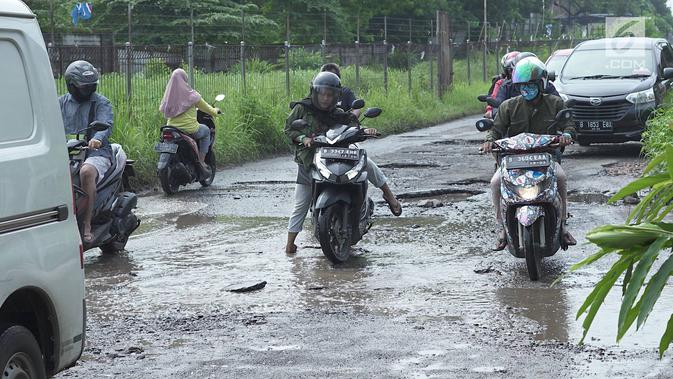 Pengendara motor berusaha menghindari jalan rusak yang menjadi kubangan air di Jalan Raya Gas Alam, Depok, Jawa Barat, Selasa (7/5). Kondisi jalan yang tidak kunjung diperbaiki tersebut menjadi kubangan air setiap hujan serta berbahaya bagi keselamatan pengguna jalan (Liputan6.com/Immanuel Antonius)