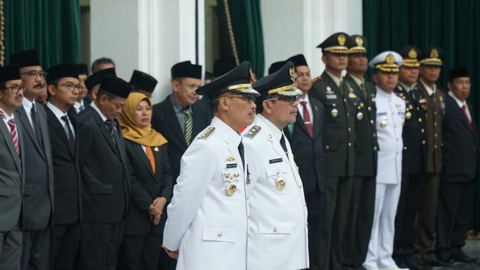 Liputan6.com, Bandung - Bupati dan Wakil Bupati Cirebon terpilih, Sunjaya Purwadisastra-Imron Rosyadi, dilantik oleh Gubernur Jawa Barat Ridwan Kamil. Namun sesuai aturan, selang beberapa menit dilantik, Sunjaya yang berstatus sebagai terdakwa dugaan suap terkait jual-beli jabatan di Kabupaten Cirebon, langsung diberhentikan sementara.