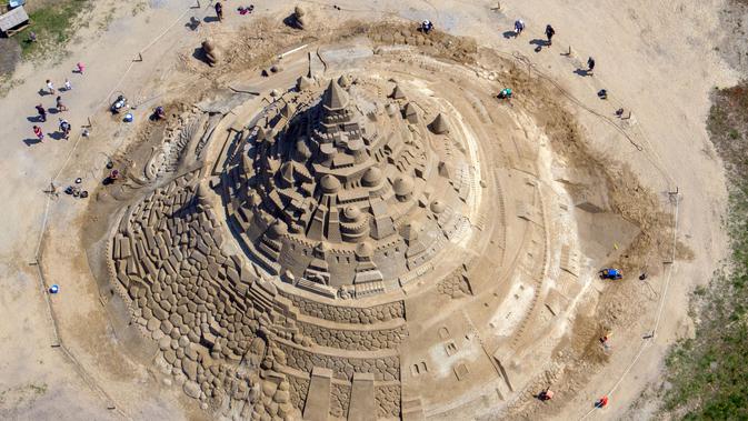 Pemahat beraktivitas di istana pasir tertinggi pada kompetisi tahunan "Sand Sculptures Festival" di Binz, Pulau Reugen di Laut Baltik, Jerman, 5 Juni 2019. Istana pasir itu berhasil memecahkan rekor sebagai istana pasir tertinggi di dunia dengan rincian ketinggian 17,66 meter. (Jens Büttner/dpa/AFP