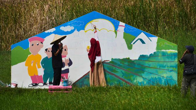 Seorang pria melihat seniman lokal melukis mural di tengah sawah selama The Art of Color Sensation 2019 di desa wisata Gampong Nusa, Lhoknga, Aceh, Minggu (16/6/2019). Kegiatan yang mengangkat kearifan lokal lewat seni mural ini menjadi media promosi bagi Gampong Nusa. (CHAIDEER MAHYUDDIN/AFP)