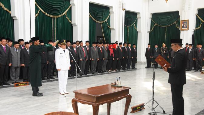 Liputan6.com, Bandung - Gubernur Jawa Barat Ridwan Kamil melantik Pelaksana Tugas (Plt) Bupati Bekasi Eka Supria Atmaja menjadi kepala daerah definitif di Gedung Sate, Kota Bandung, Rabu (12/6/2019).