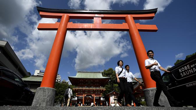 Pemandangan torii (gerbang masuk) ke Kuil Ikuta terlihat di pusat Kobe (5/10/2019). Kuil, dengan sejarah lebih dari 1.800 tahun ini dikatakan sebagai salah satu kuil tertua di Jepang. (AFP Photo/Monteforte)