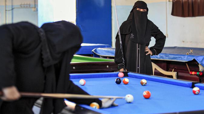 Sejumlah wanita Yaman mengikuti kejuaraan biliar lokal di sebuah gedung olahraga di ibu kota Sanaa, Yaman (16/12/2019).