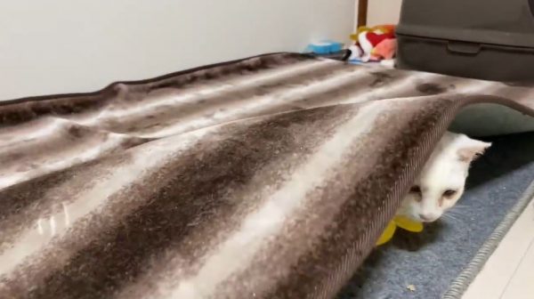 投稿者さんが片付けなどを済ませて曉璘ちゃんのもとに行くと、ラグの下で拗ねていました。