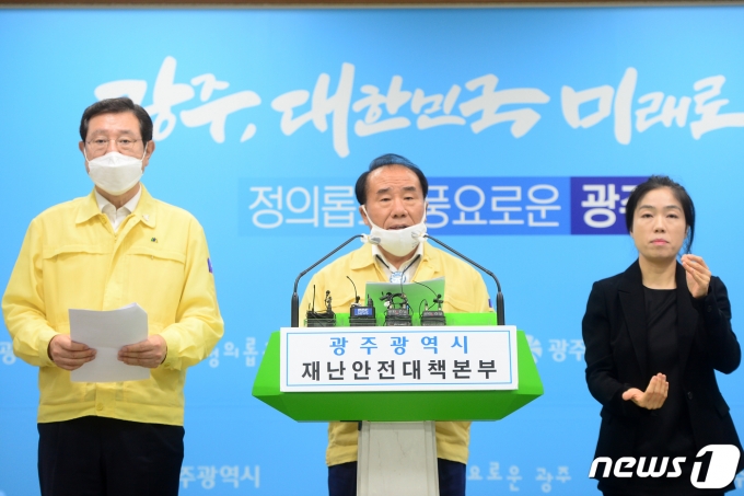 | (광주=뉴스1) 한산 기자 = 장휘국 광주시교육감이 5일 오후 광주 서구 광주시청에서 신종 코로나바이러스 감염증(코로나19) 관련 광주시·광주시교육청 합동 브리핑을 하고 있다. 장 교육감은 북구 전체 유치원·초·중·고등학교에 대해 고3 학생을 제외하고 오는 12일까지 등교중지한다고 밝혔다.왼쪽은 이용섭 광주시장. 2020.7.5/뉴스1 |