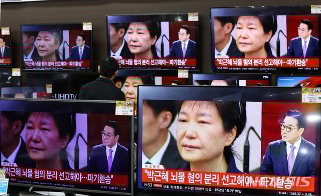| 【서울=뉴시스】이영환 기자 = 29일 오후 서울 용산구 전자랜드 용산점의 한 전자제품 판매점에 박근혜 전 대통령과 이재용 삼성전자 부회장, 최순실씨의 국정농단 사건 관련 대법원 전원합의체 선고 공판이 중계되고 있다. 2019.08.29. 20hwan@newsis.com |