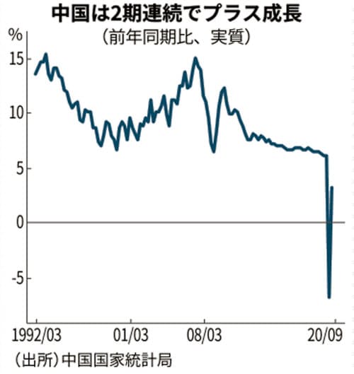 中国経済は新型コロナウイルスが直撃した20年1~3月、1992年に公表を始めた四半期ベースでは初のマイナス成長に沈んだ。その後、ウイルスを抑えこんで生産が回復し、4~6月はプラス成長に戻った。