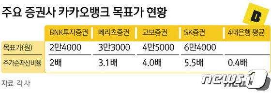 카카오뱅크를 바라보는 증권업계의 전망은 엇갈리고 있다. 은행업종은 대규모 자본을 바탕으로 이익을 창출하는 기업이기 때문에 적정주가 산정에 주가순자산비율(PBR)을 활용한다. 국내 4대 금융지주의 평균 PBR은 0.4배 수준이고, 금융 플랫폼 기업의 PBR은 7배를 넘어서는 경우도 많다. 카카오뱅크를 은행업으로 볼지, 금융 플랫폼으로 볼지에 따라 목표주가가 크게 달라질 수 있는 것이다.