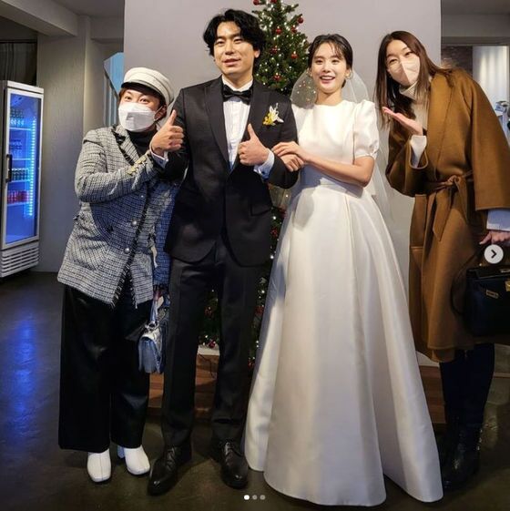 박나래는 25일 자신의 인스타그램에 "#나혼자산다 #결혼 #명예졸업 #얼장님 #제주도 #결혼이라니 #이시언 #축하합니다 #기안84 #한혜진 #박나래 아름다운 신부 #서지승 뭔가 찡허네"라는 글과 함께 사진을 올렸다.